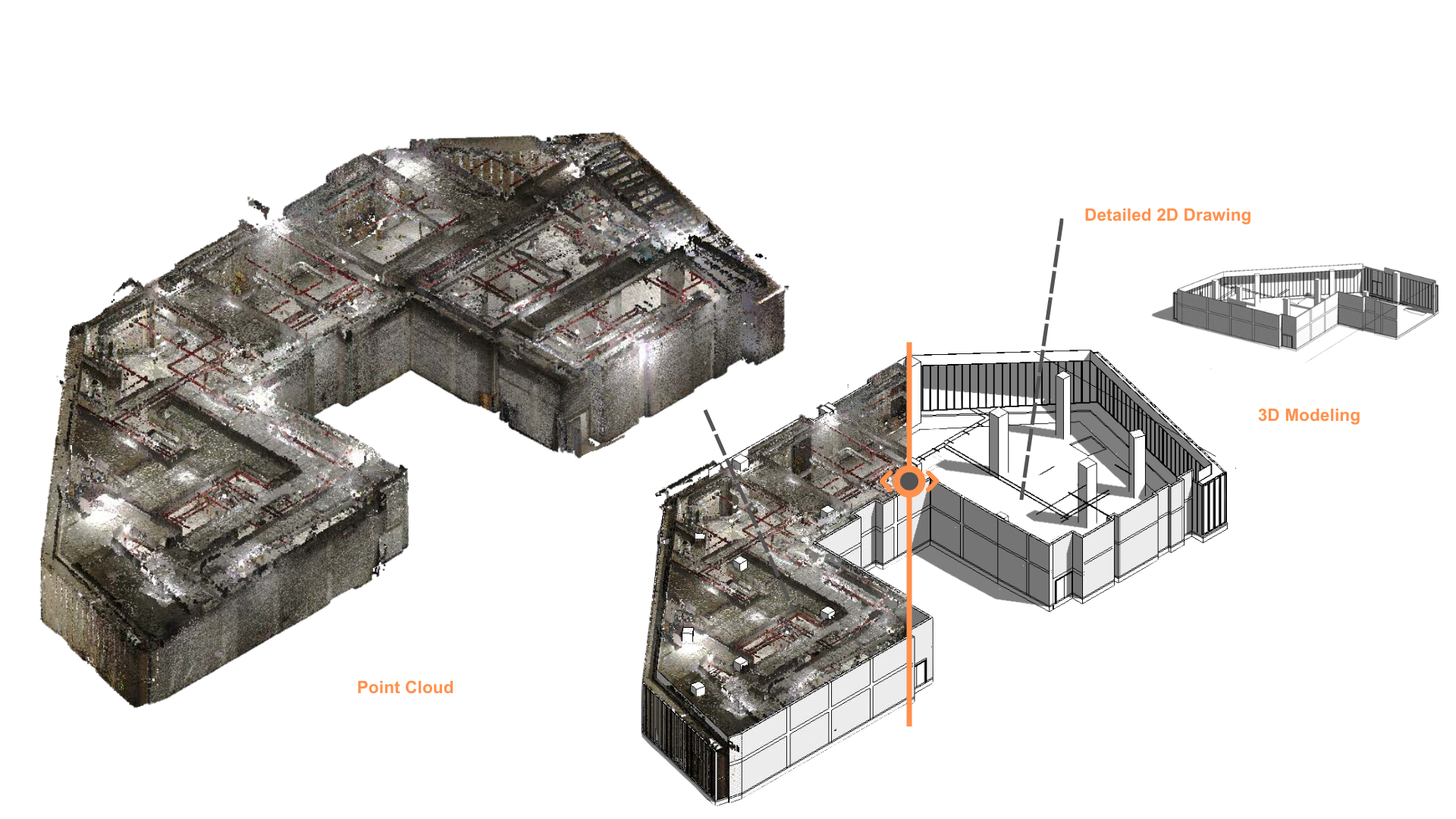 Our team transforms raw point cloud data into LOD 500 BIM models and construction-ready 2D drawings, making it easy for designers, contractors, and facility managers to work from a single source of truth.